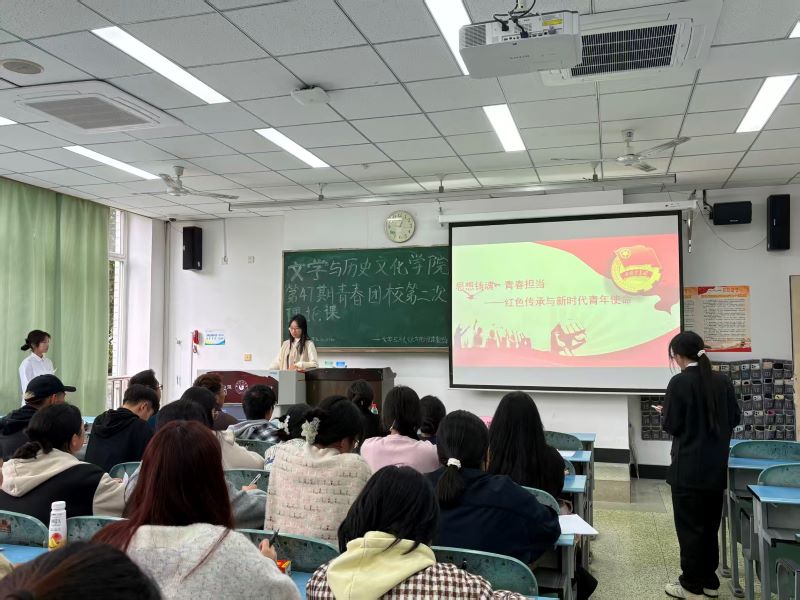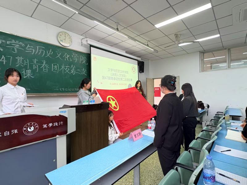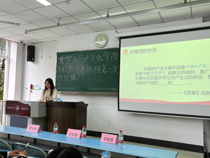 (本网讯:文/刘雨寒,图/徐全秀)为引导广大团员青年坚定理想信念、筑牢精神根基,2025年10月30日12点40分,文学与历史文化学院第47期青春团校第二次理论课在行知楼311教室举行。