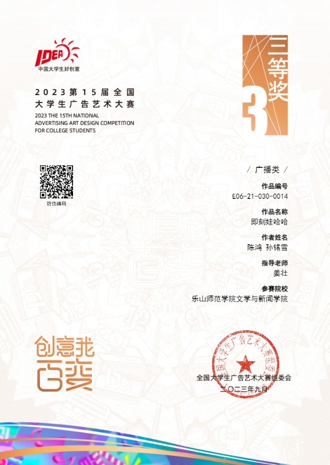 近日,202315届全国大学生广告艺术大赛获奖名单公布,由文新学院教师姜壮指导,播主专业学生陈鸿、孙铭雪创作的广播类作品《即刻娃哈哈》获得三等奖。由文新学院教师胡巍可指导,播主专业学生刘浔、袁鹏举创作的广播类作品《让你的思念以5G的速度到达》;播主专业学生李晟吉、刘佳雨创作的广播类作品《咖位-初恋的味道》获得优秀奖。