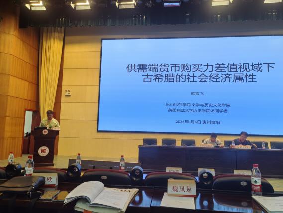 本网讯(文图/韩雪飞 审核/可晓锋)。9月6日,2025年中国世界古代史年会在贵州贵阳贵州师范大学开幕,我院历史学教研室韩雪飞博士在第一会场发言,发言题目为《人工智能时代的世界古代史研究:供需端购买力差值视域下的古希腊社会经济属性》。