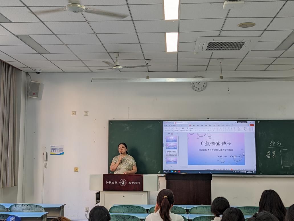 在汉语国际教育专业导论课中,陈熹老师重点解读了英语课程在专业学习中的重要性,并就语言学习方法提出建议。聂小丽老师系统介绍了专业背景、人才培养方案及未来发展方向,徐立昕老师则从古代文学史学习角度出发,分享了背诵与写作的有效方法。