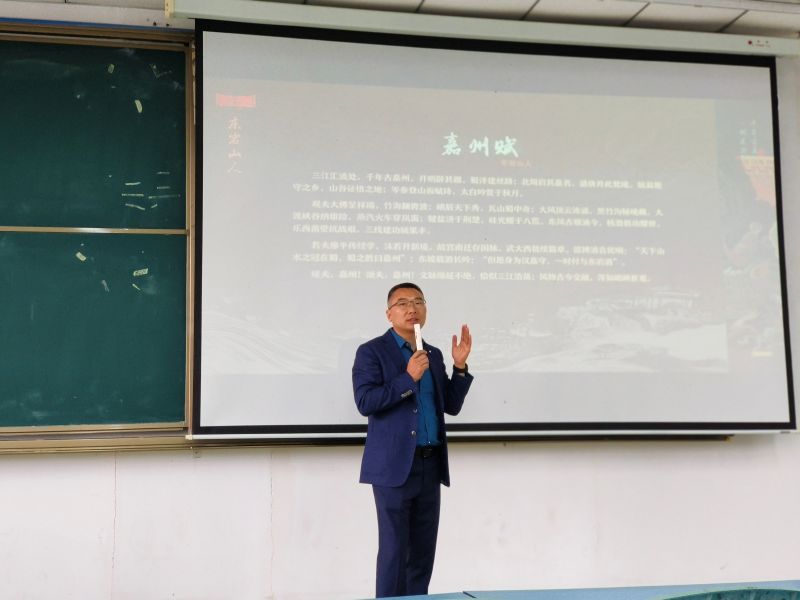 从赵昱斩蛟的传说,到岑参任乐山太守的宦迹,再到苏洵《初发嘉州》的诗文印记、苏轼与嘉州的不解之缘,万谦老师将历史人物同东岩的故事娓娓道来,为大家勾勒出一幅立体的古嘉州人文画卷。万谦老师还介绍了犍为王氏书楼、黄庭坚与 乐山”市名渊源,并展示《嘉州赋》《南丝路铭》及名家书法,深化学子对东岩文化的理解。