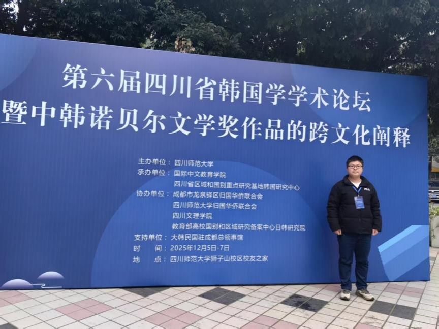 2025年12月5日至7日,第六届四川省韩国学学术论坛——暨中韩诺贝尔文学奖作品的跨文化阐释在四川师范大学狮子山校区举办。乐山师范学院文学与历史文化学院专任教师任敬文受邀参会,并以《六朝志怪小说原型的韩国传播——以<新罗殊异传><金鳌新话>为例》为题作了主题发言。本次论坛由四川师范大学主办,由四川师范大学国际中文教育学院承办,由大韩民国驻成都总领事馆提供支持。此次学术论坛汇聚了省内外多所高校的韩国学研究专家学者,众多专家学者围绕中韩文化交流、文学互鉴等议题展开了深入的研讨。