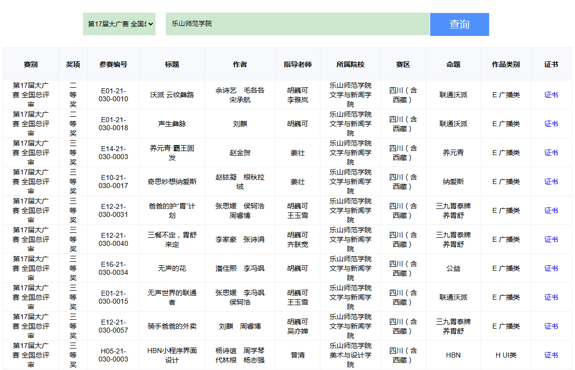在本届大赛中,我校作品共取得全国二等奖2项、全国三等奖8项、优秀奖7项,国奖总数实现新突破。其中,广播类作品《声生彝脉》(作者:刘麒,指导老师:胡巍可)以及《沃派 云纹彝路》(作者:余诗艺、毛各各、宋承航,指导老师:胡巍可、李雅岚)成为川内广播类唯二全国二等奖(川内无国一),并受邀参加颁奖盛典。