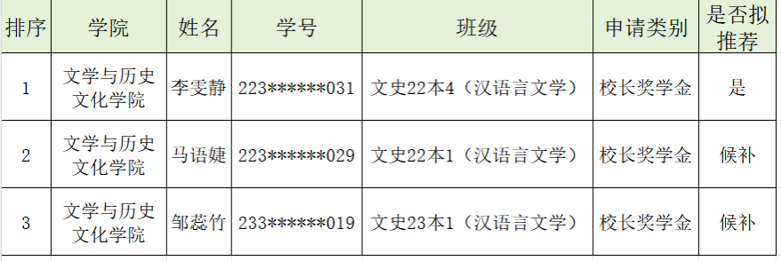 附:文学与历史文化学院2025年校长奖学金拟推荐名单