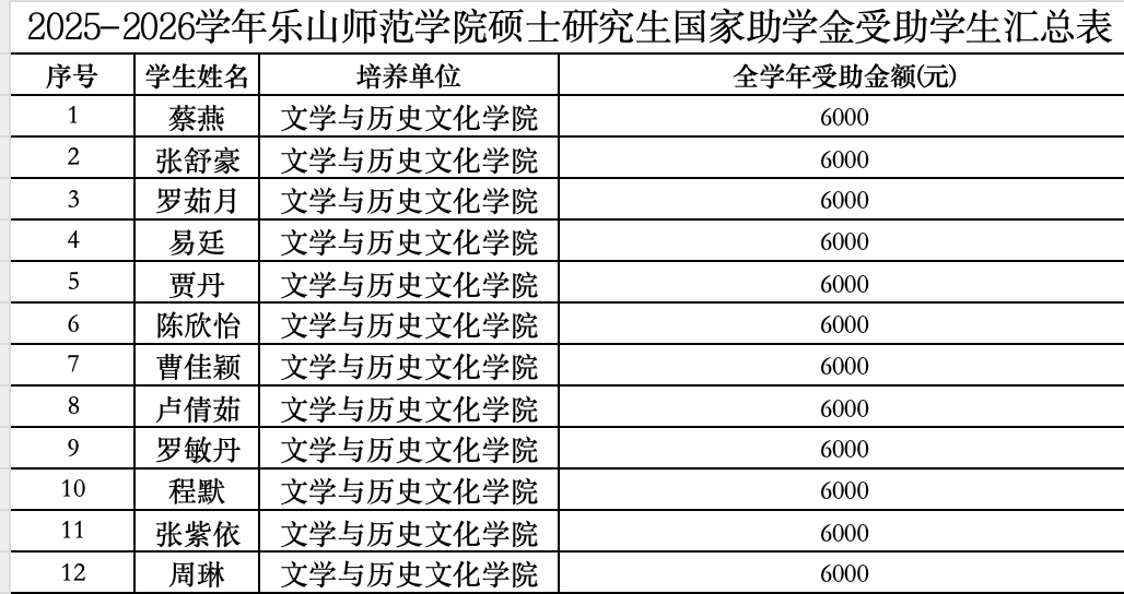 根据《学生资助资金管理办法》(财教〔2021〕310号)、《四川省教育厅关于做好2025年高校国家奖助学金评审工作的通知》(川教函〔2025〕275号)、《乐山师范学院研究生奖助学金管理办法(暂行)》等文件要求,按照宣传动员、个人申报、培养单位初评的工作步骤,依据研究生国家助学金认定条件、评审实施细则及个人递交材料,经学院2025年硕士研究生国家助学金评审小组初审,现将2025年文学与历史文化学院硕士研究生国家助学金结果名单公示如下: